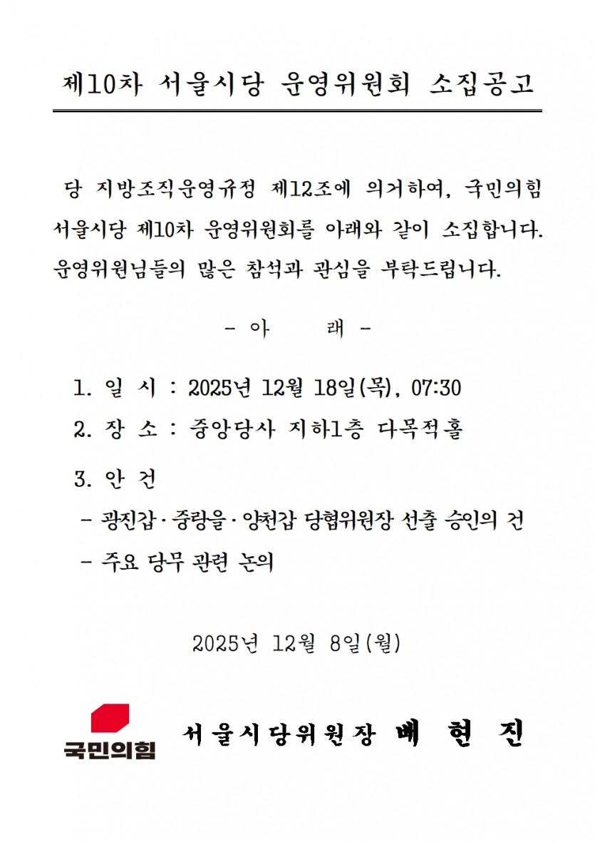 [공고문] 제10차 서울시당 운영위원회 소집공고