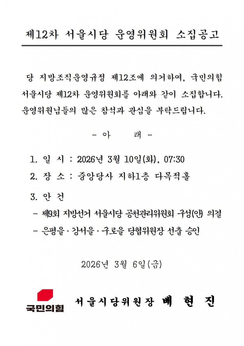 [공고문] 제12차 서울시당 운영위원회 소집공고