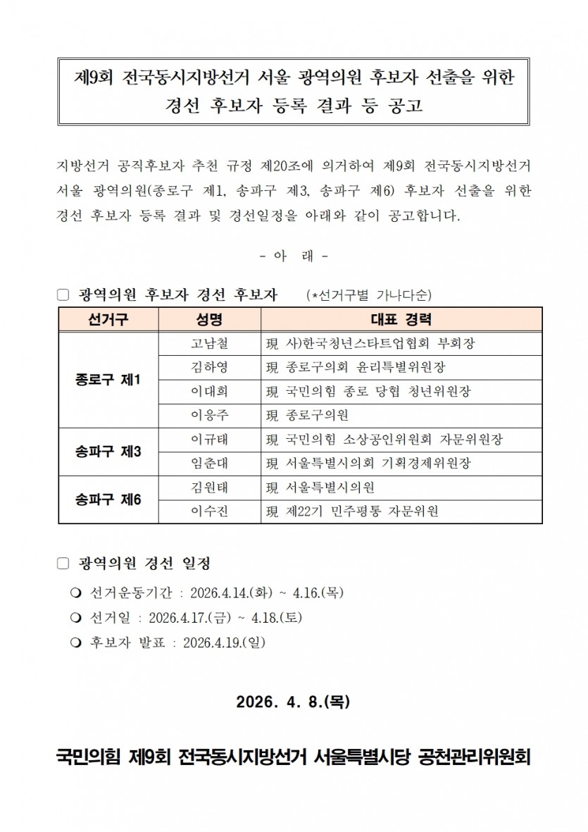제9회 전국동시지방선거 광역의원 후보자 선출을 위한 경선 후보자 등록 결과 등 공고