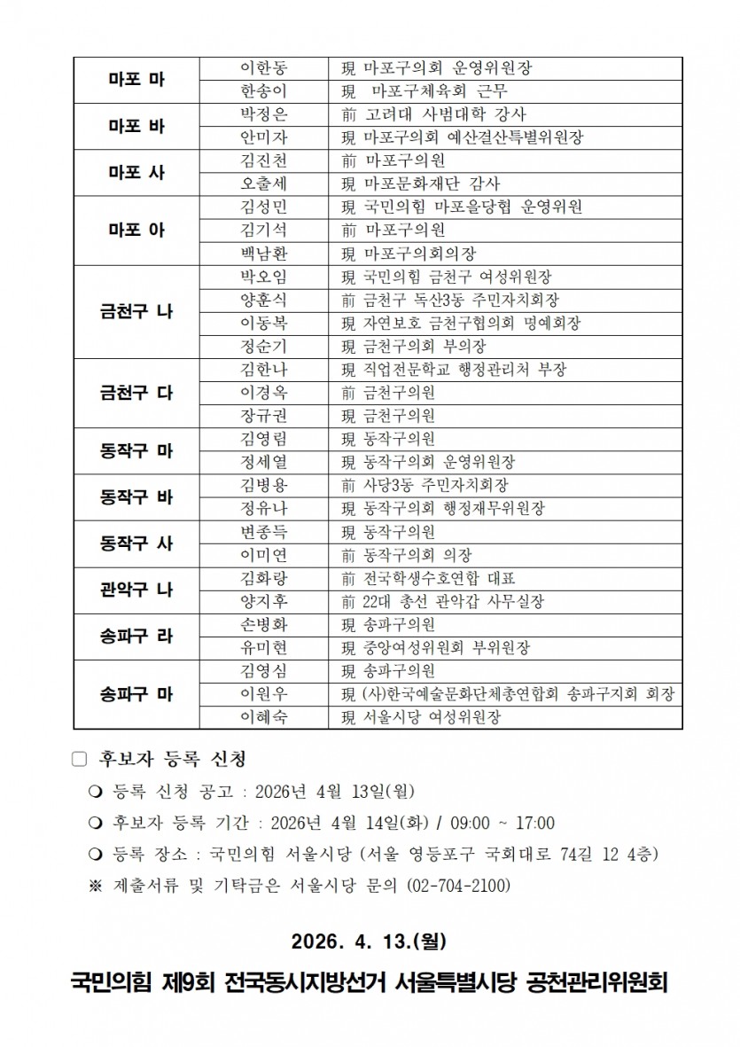 제9회 전국동시지방선거 서울 기초의원 후보자 선출을 위한 경선 후보자 등록 신청 공고
