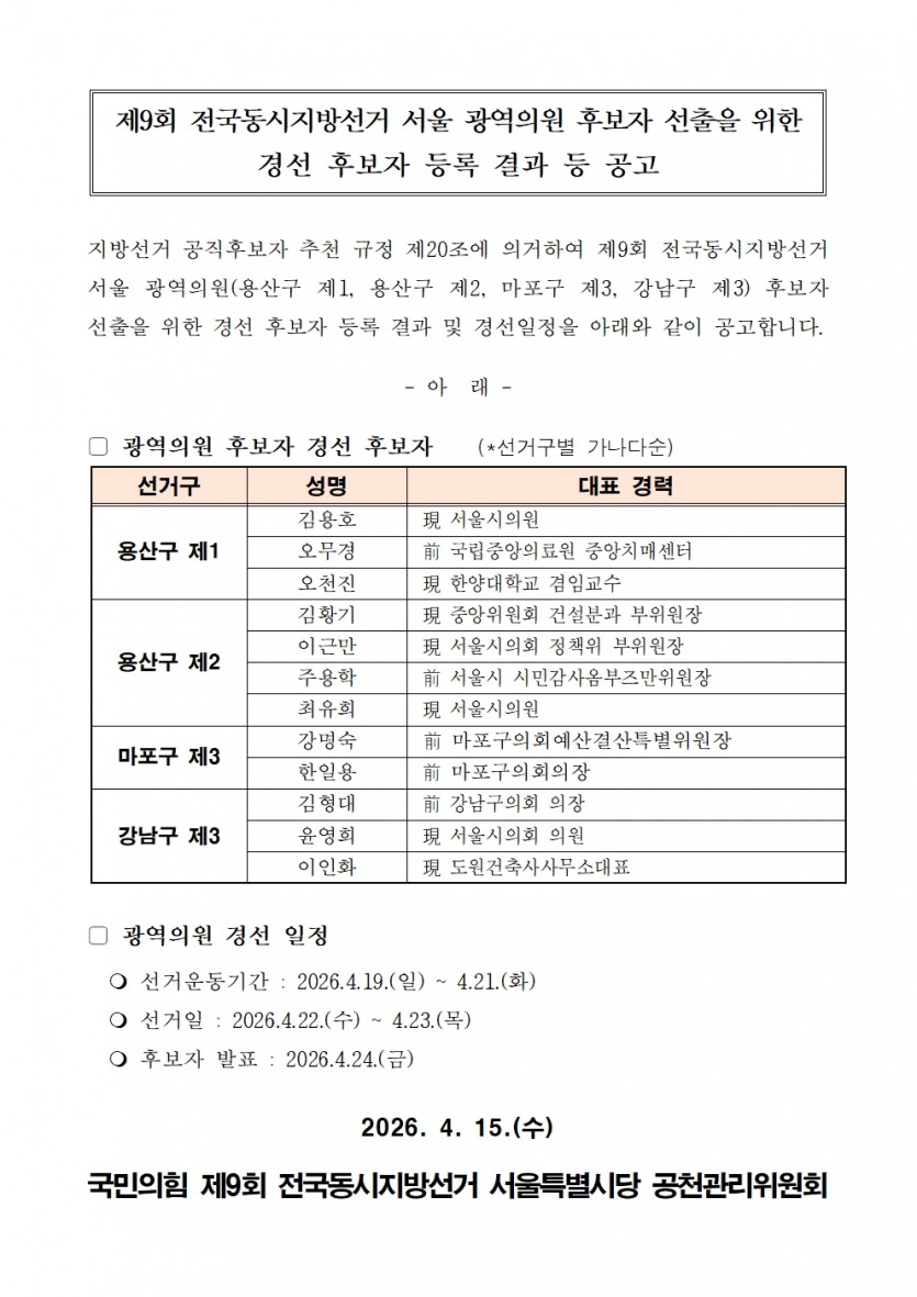 제9회 전국동시지방선거 광역의원 후보자 선출을 위한 경선 후보자 등록 결과 등 공고