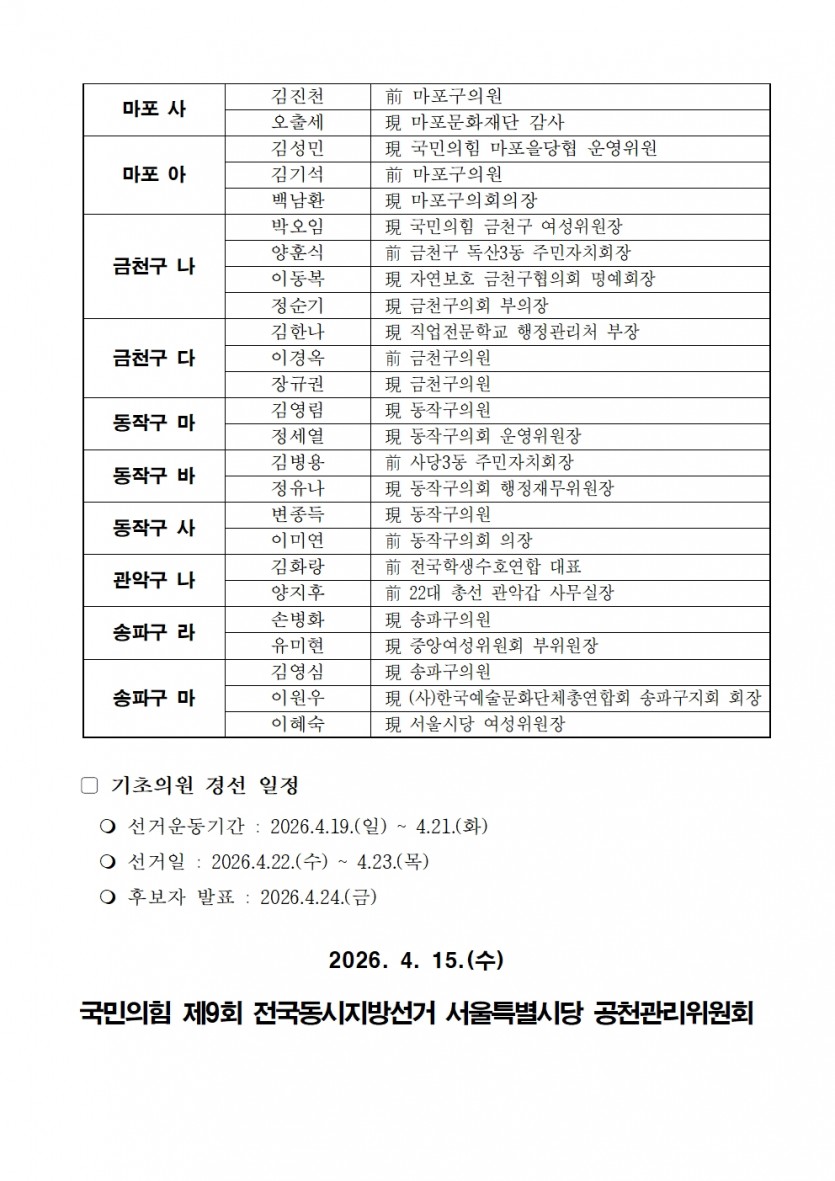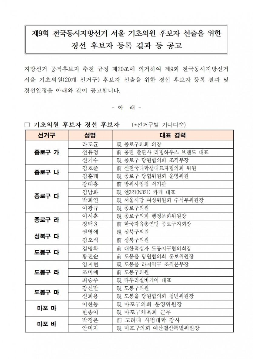 제9회 전국동시지방선거 기초의원 후보자 선출을 위한 경선 후보자 등록 결과 등 공고