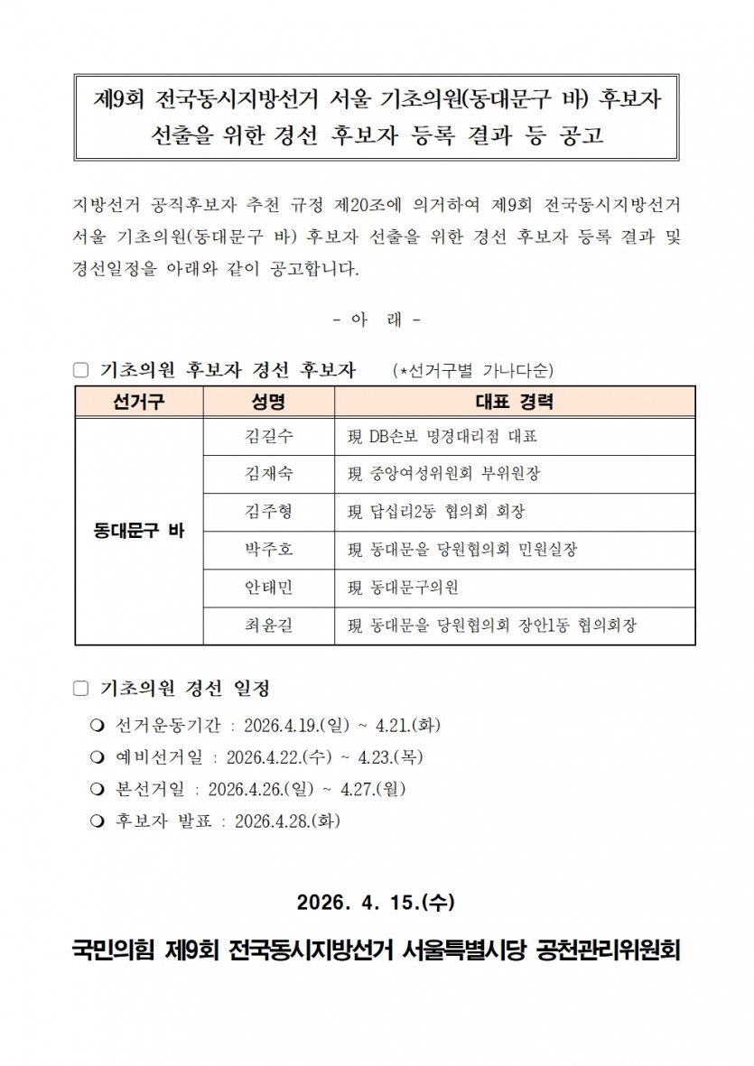 제9회 전국동시지방선거 기초의원(동대문구 바) 후보자 선출을 위한 경선 후보자 등록 결과 등 공고