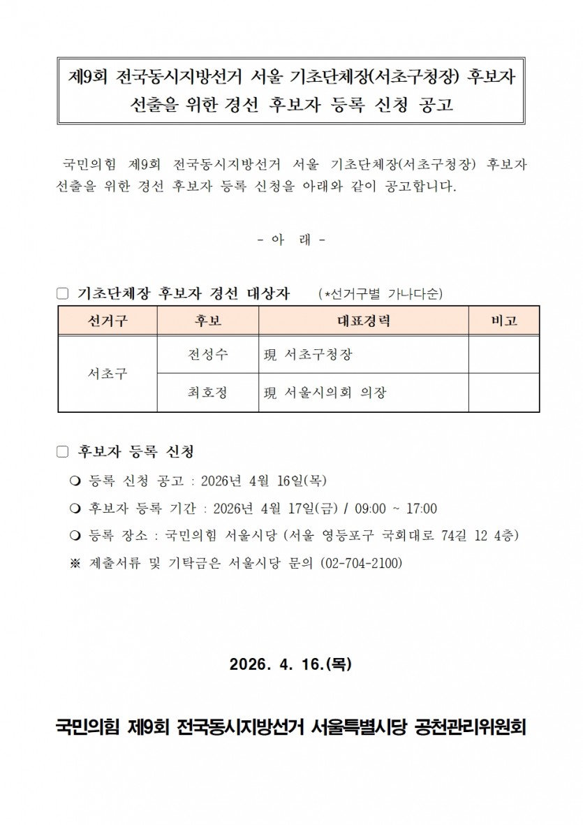 제9회 전국동시지방선거 서울 기초단체장(서초구청장) 후보자 선출을 위한 경선 후보자 등록 신청 공고