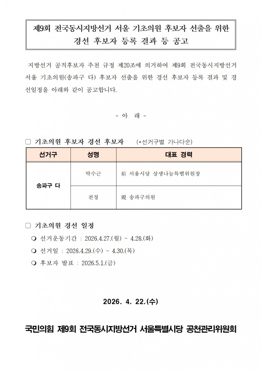 제9회 전국동시지방선거 서울 기초의원 후보자 선출을 위한 경선 후보자 등록 결과 등 공고