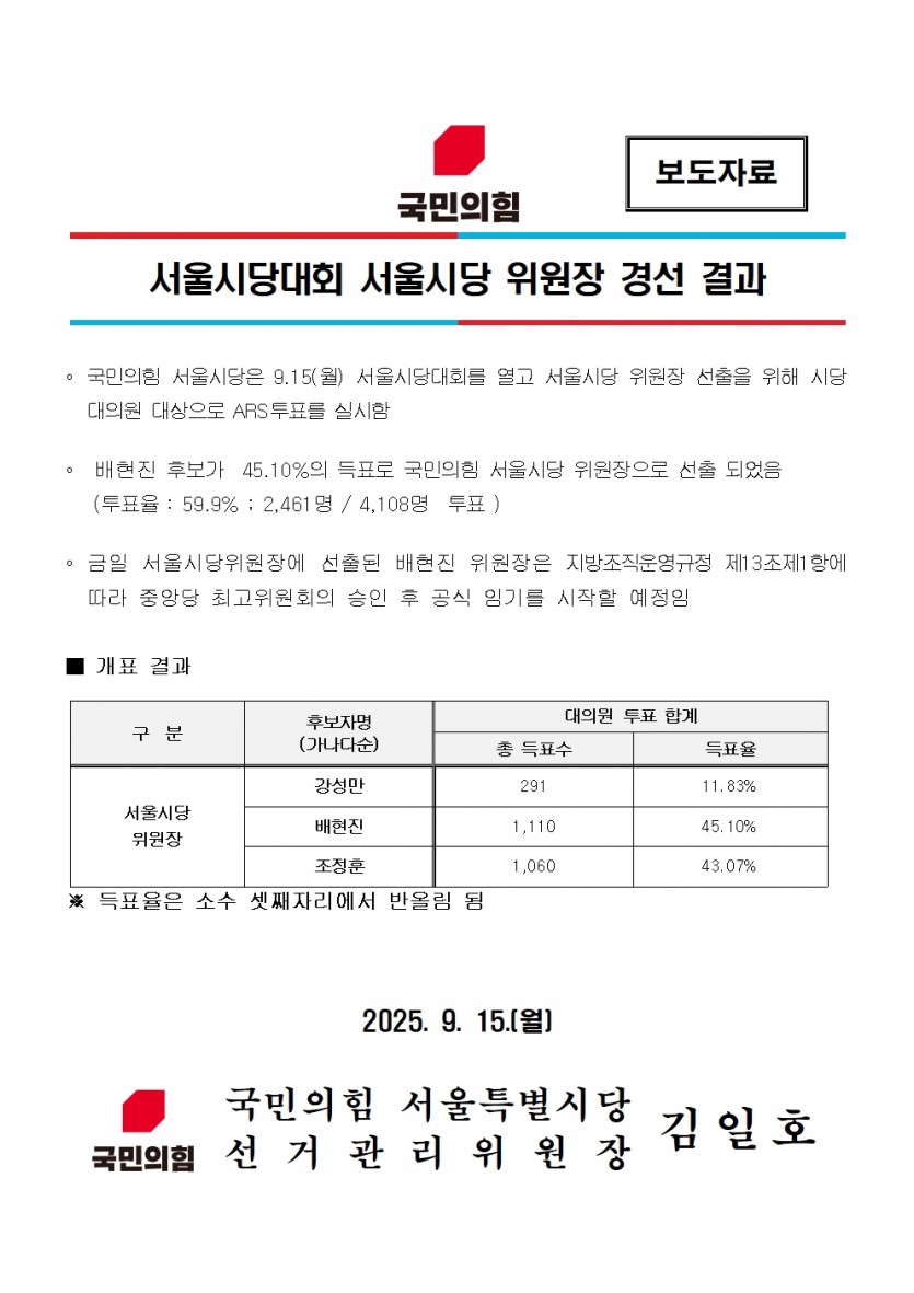 [보도자료] 사울시당대회 서울시당위원장 경선 결과