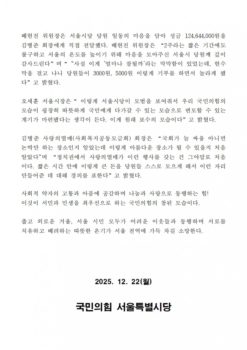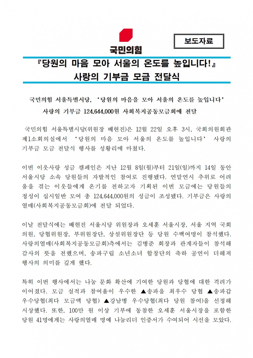 [보도자료] 당원의 마음 모아 서울의 온도를 높입니다! 사랑의 기부금 모금 전달식