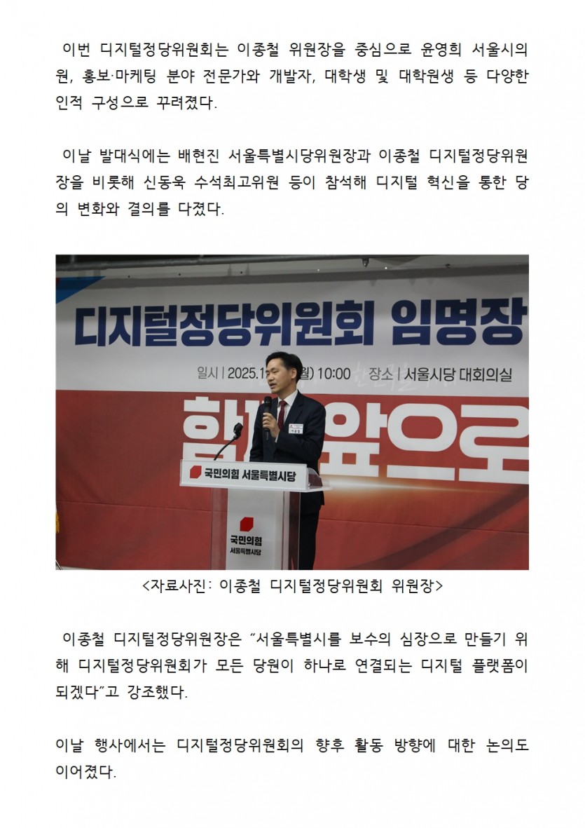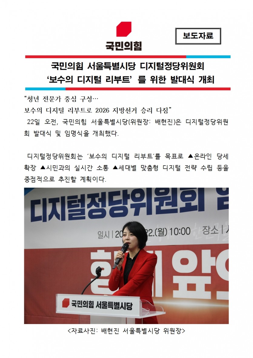 [보도자료] 국민의힘 서울특별시당 디지털정당위원회 '보수의 디지털 리부트'를 위한 발대식 개최