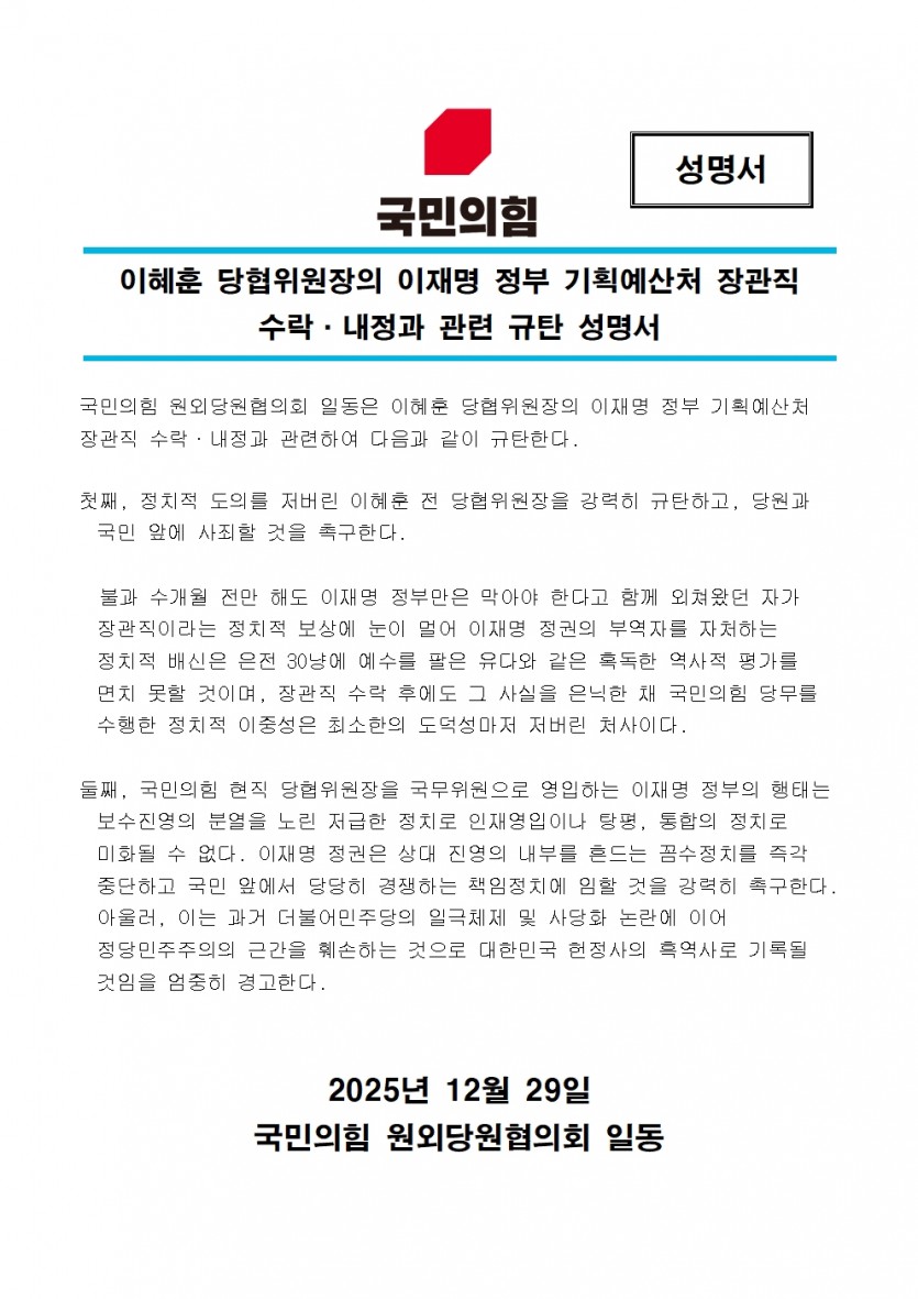 [성명서] 이혜훈 당협위원장의 이재명 정부 기획예산처 장관직 수락·내정 관련 규탄