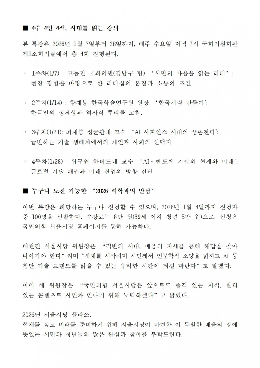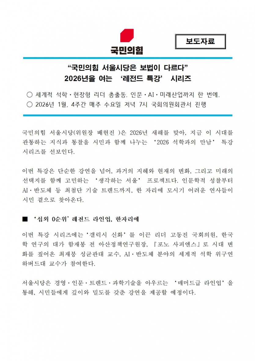 [보도자료] 서울시당 석학과의 만남 특강 개강
