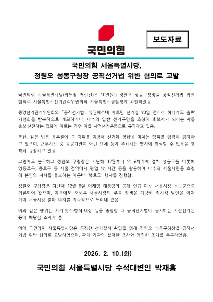 [보도자료] 정원오 성동구청장 공직선거법 위반 혐의로 고발