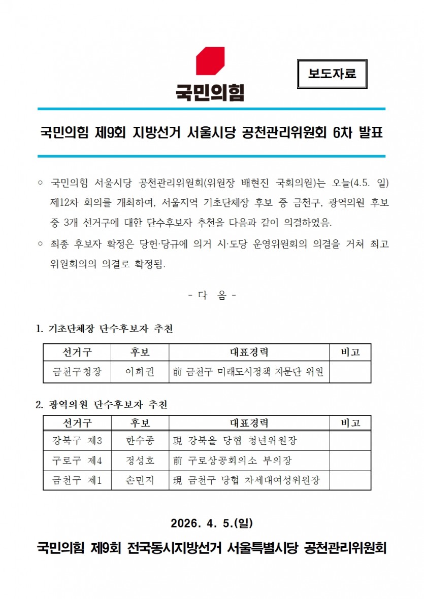 [보도자료] 국민의힘 서울시당 공천관리위원회 6차 발표