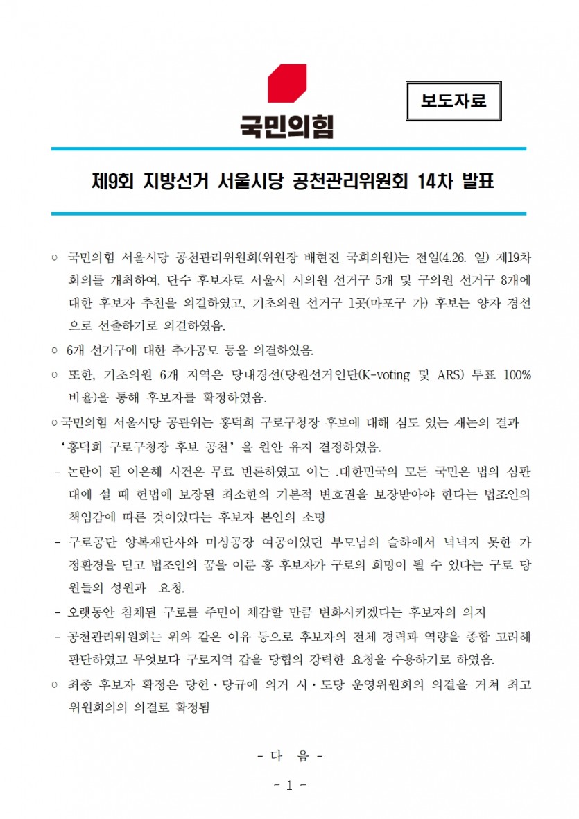 [보도자료] 국민의힘 서울시당 공천관리위원회 14차 발표